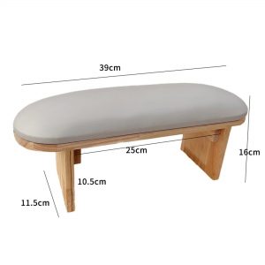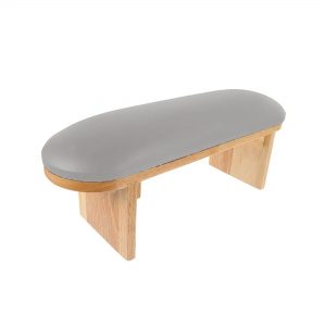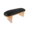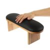 Nail armrest with a wooden base and an elegant black leather top for comfortable and stable hand placement during nail treatments. Its ergonomic design allows a UV/LED curing lamp to be placed underneath, saving space and improving workflow efficiency.