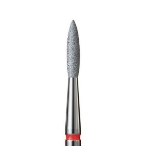 Διαμαντόφρεζα με σχήμα φλόγας, τo μήκος της είναι μέτριο προς μακρύ και χρώμα κόκκινο (μαλακό). Ιδανική για ανασήκωμα επωνυχίου, το σχήμα της σας επιτρέπει να ανασηκώσετε τα επωνύχια και να αφαιρέσετε την μεμβράνη που είναι κολλημένη στην πλάκα του νυχιού με ακρίβεια. Απομακρύνει και λειαίνει τις σκληρύνσεις δέρματος περιμετρικά γύρω από την ονυχαία πλάκα