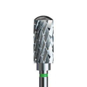 Φρέζα καρβιδίου σε σχήμα βαρελάκι. Σκληρής τραχύτητας με πράσινο κρίκο. Με στρογγυλεμένη κεφαλή που δεν τραυματίζει το δέρμα. Κατάλληλο για αφαιρεση σκληρών υλικών, όπως ακρυλικό, καθώς και για τη διαμόρφωση της καμπύλης κάτω από το νύχι.