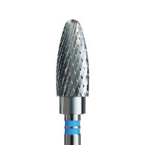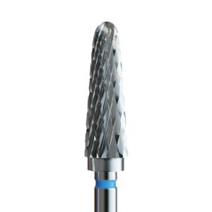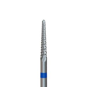 Φρέζα καρβιδίου σε λεπτό κωνικό σχήμα. Μέτριας τραχύτητας με μπλε κρίκο. Κατάλληλη για αφαίρεση Gel και Acrygel. Το λεπτό του σχήμα επιτρέπει την ενσωμάτωση υλικού κοντά στα επωνύχια, καθώς και την διαμόρφωση κάτω από το νύχι.