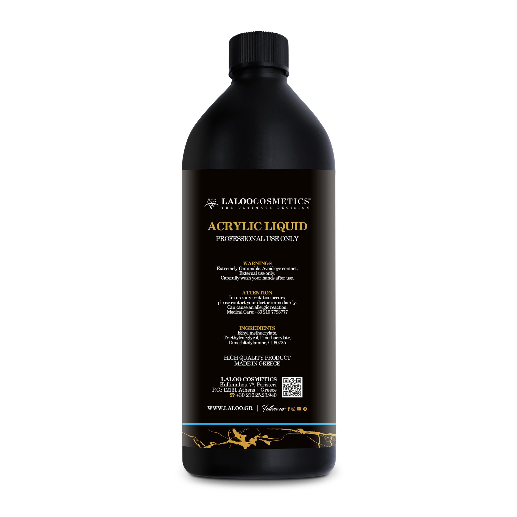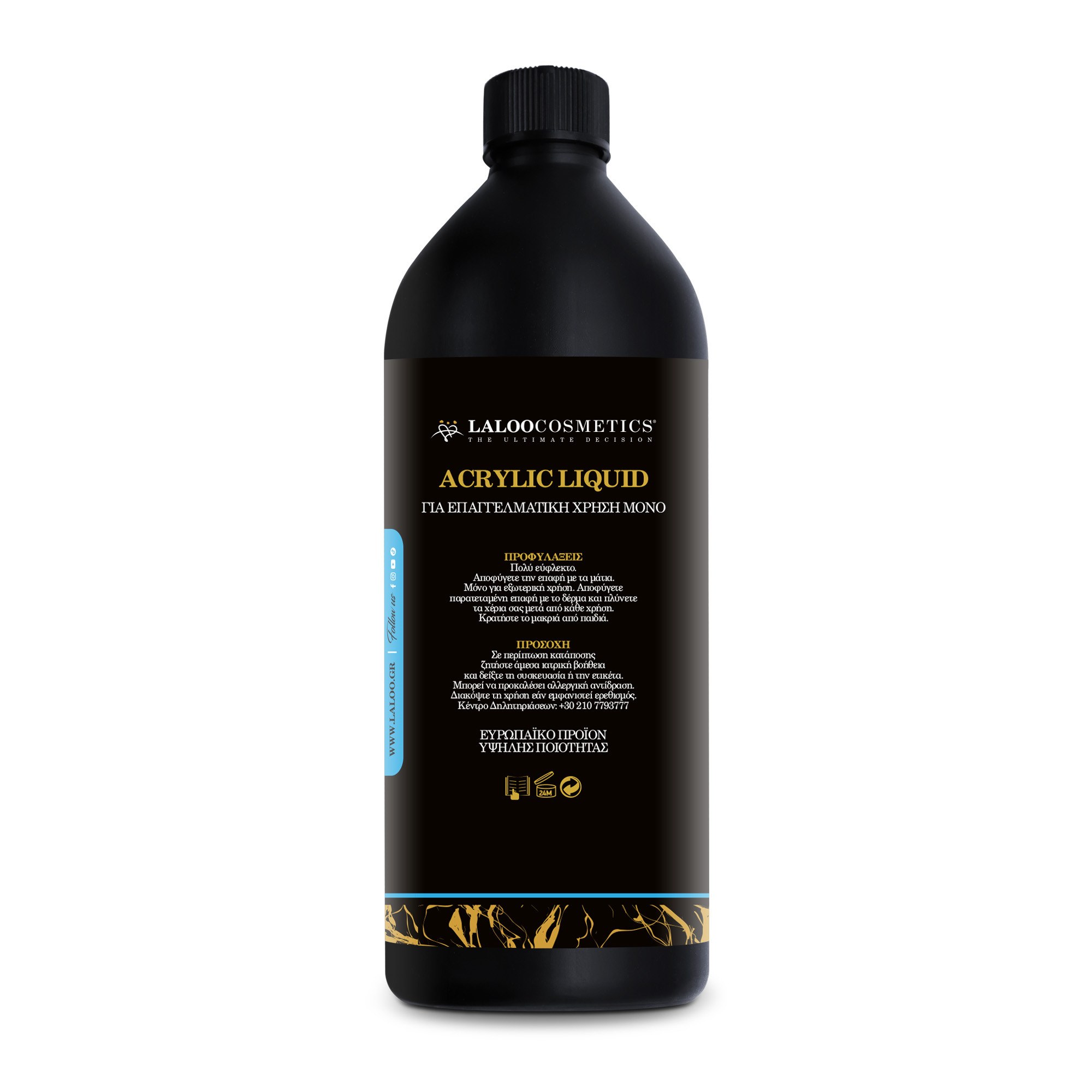 Το ακρυλικό υγρό συνδυάζεται απόλυτα με τις ακρυλικές πούδρες της Laloo Cosmetics. Είναι μεσαίας ταχύτητας υγρό και η πρόσμιξη του με τις σκόνες ακρυλικού Laloo Cosmetics δίνει επαρκή χρόνο στον τεχνίτη για το χτίσιμο ενός ακρυλικού νυχιού. Είναι soak off και μπορεί να αφαιρεθεί είτε με καθαρό ασετόν, είτε με τη χρήση τροχού και την επιλογή κατάλληλης φρέζας.