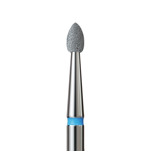Διαμαντόφρεζα σε σχήμα στρογγυλής φλόγας. Μέτριας  τραχύτητας με μπλε κρίκο. Κατάλληλη για ανασήκωση και κόψιμο επωνυχίων .